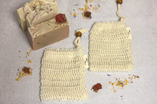 A good soap bag or tray is important to increase the life of your soap bar, by allowing it to dry quickly after use. Soap saver bags help your soap with boosted lather, easy grip and exfoliation. Our soap tray is made of wood and helps the bar to not to sit in water. Our knitted homemade washcloths are great for our whipped soaps and sugar scrubs. Homemade with love.